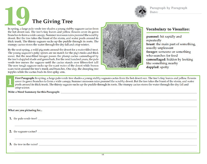 The Visualizing and Verbalizing® Workbooks help students develop concept imagery and language comprehension. The Living Planet workbook features high-imagery stories about the natural world, including animals, plants, and other features of planet Earth. Helpful icons show what area of science curriculum each story fits best.