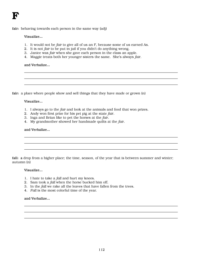 Use Vanilla Vocabulary with the Visualizing and Verbalizing program, or on its own, to increase vocabulary skills in adults or children. Each entry also includes a section for the individual to compose their own sentence, along with four sentences to create meaning and imagery for each word.