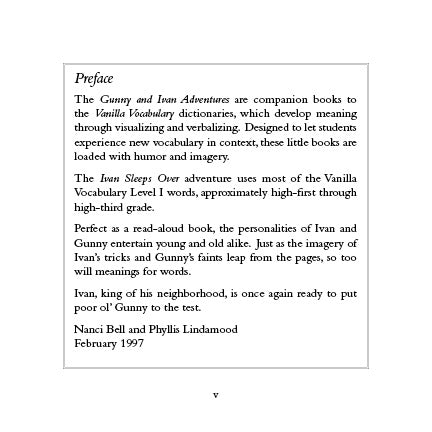 The read-aloud Gunny and Ivan Adventure books are hilarious companion readers to the Vanilla Vocabulary® series. Students are exposed to vocabulary in context, taken from the Vanilla volumes, in delightful high-imagery stories.