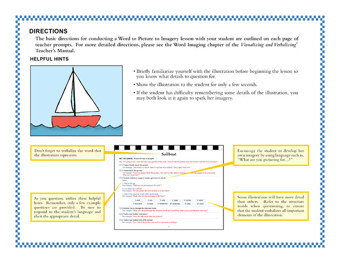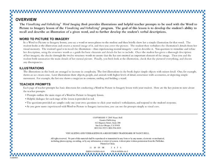 The Visualizing and Verbalizing® (V/V®) program develops concept imagery - the ability to create an imagined gestalt from language - as a basis for comprehension and higher order thinking. The development of concept imagery improves reading and listening comprehension, memory, oral vocabulary, critical thinking, and writing.