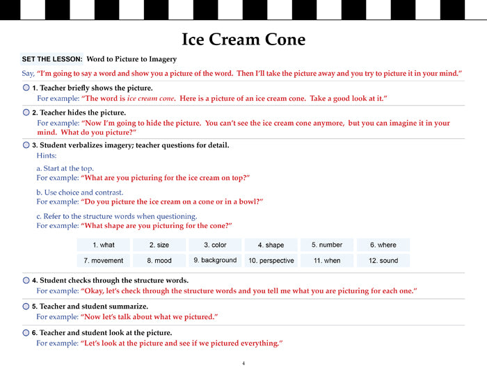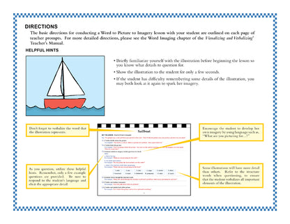 Provides 17 simple illustrations for students to recall, image, and describe. Helpful teacher prompts for each illustration and a built-in tabletop easel make this book a very useful tool.